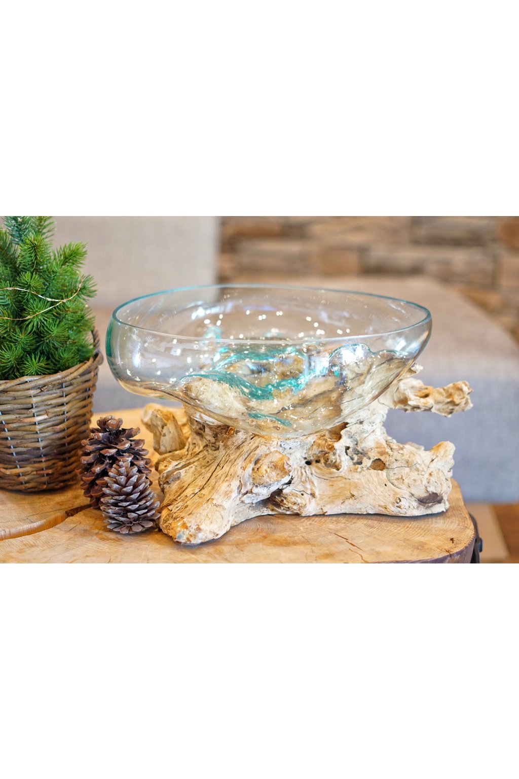 Teaková váza Liqva. Podstavec vázy je z teakového kořene z exotických zemí. Teakový kořen každé vázy je jedinečný a tudíž se nikdy nestane, že byste viděli dvě stejné vázy pohromadě. Na přírodním kořenu je posazena skleněná nádoba o průměru 40 cm a je krásným doplňkem do Vašeho domu.