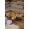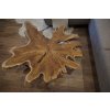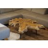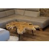 Dominantní exotický stolek z masivního plátu teakového dřeva o průměru cca 120 cm. Ručně upravený, vybroušený do hladka, ošetřený přírodními oleji. Tvar stolku je jedinečný originál jako každý strom.