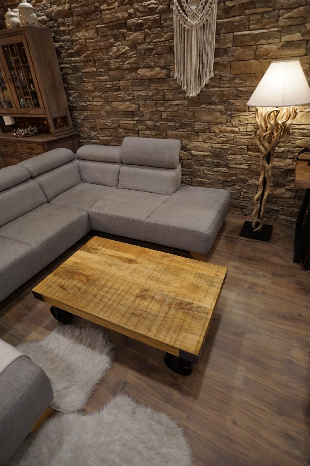 Těžký a dominantní konferenční stolek z masivního manga, v kombinaci s těžkými, ocelovými koly (netočí se, stolek je stabilní)